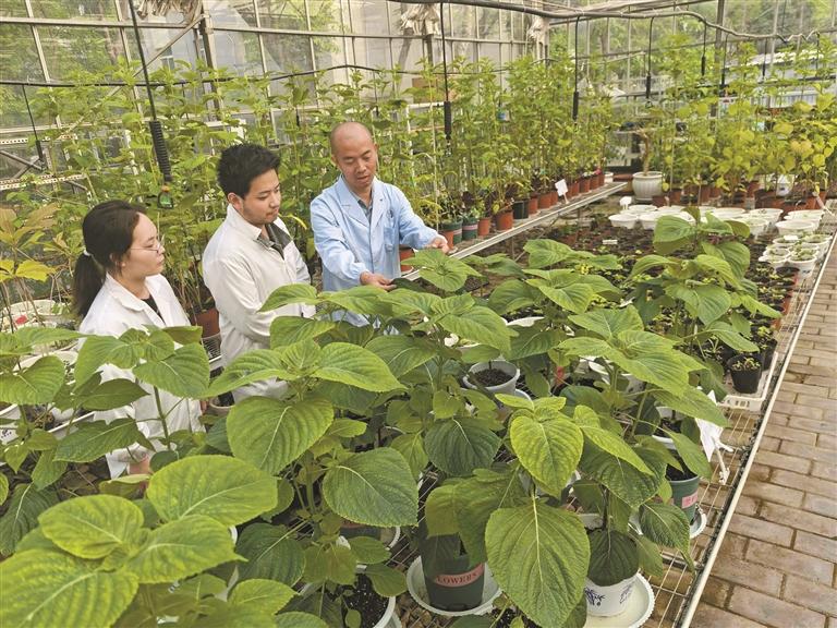 4月14日,陕西省航天育种工程技术研究中心的工作人员在观察紫苏长势。